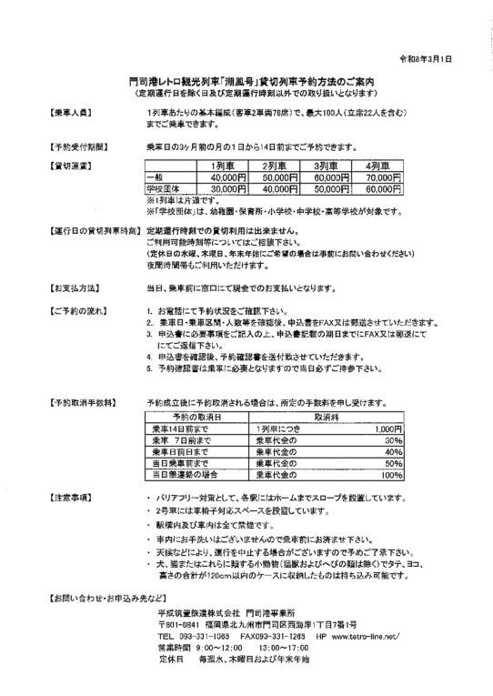 平成筑豊鉄道株式会社門司港事業所で電話にて受け付けます。